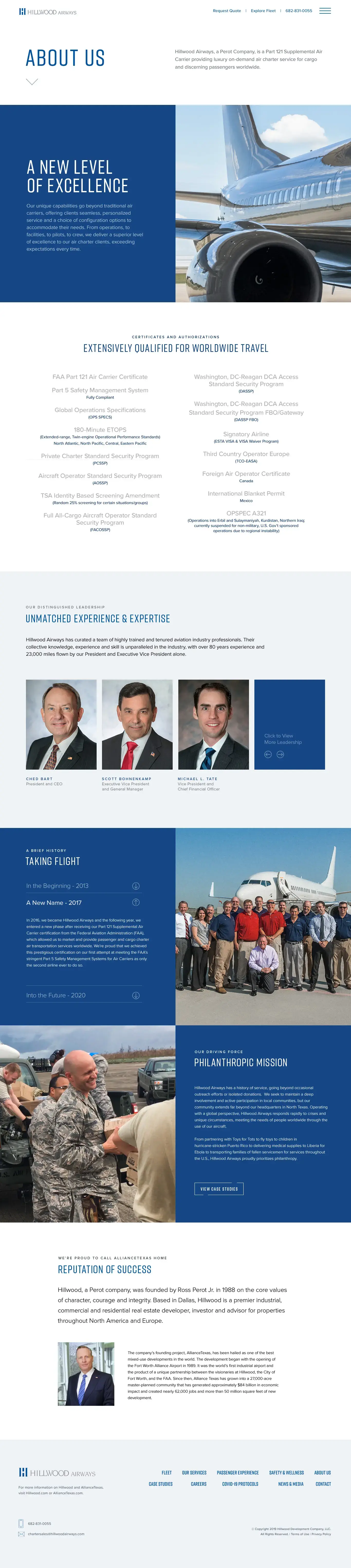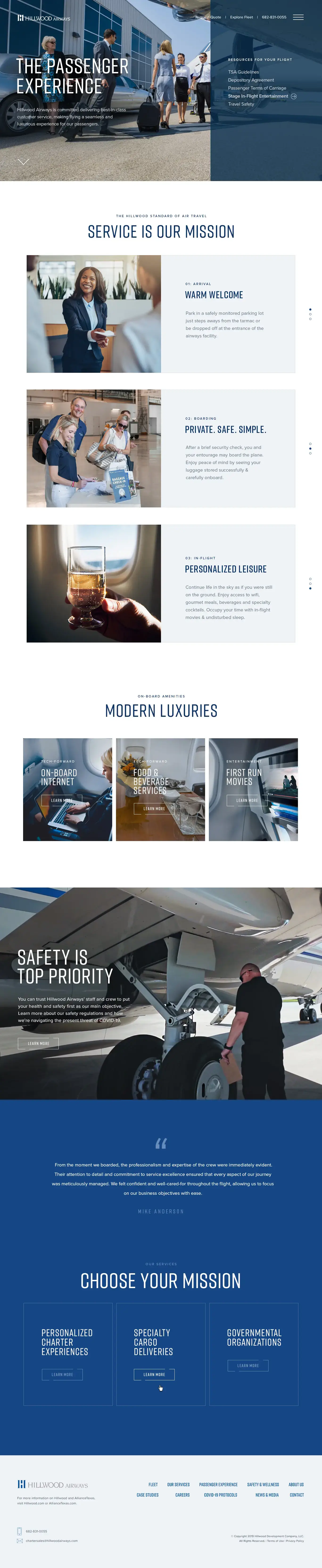 Going beyond the capabilities of other air carriers, the new site for Hillwood Airways needed to show the full scope of services and customizable options a potential client may have.